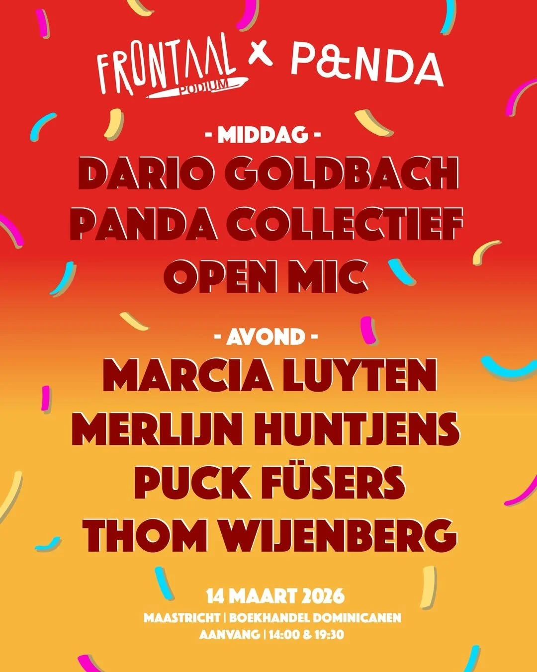 Literaire organisatie Frontaal nodigt mij uit, plus leden van het Genootschap (verzameld door literair collectief PANDA) én een open mic.